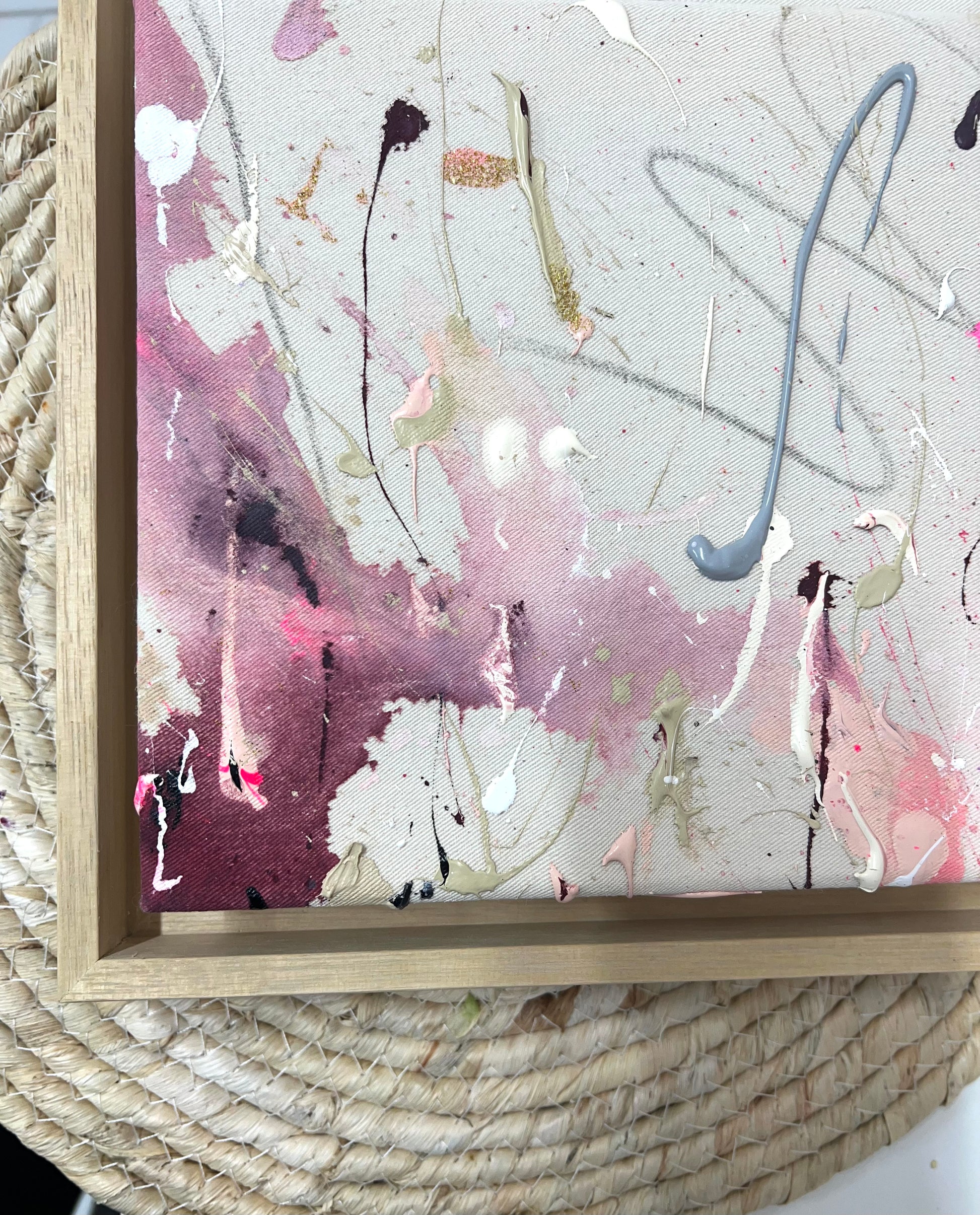 Hand-painted acrylic painting on canvas, including oak shadow gap frame