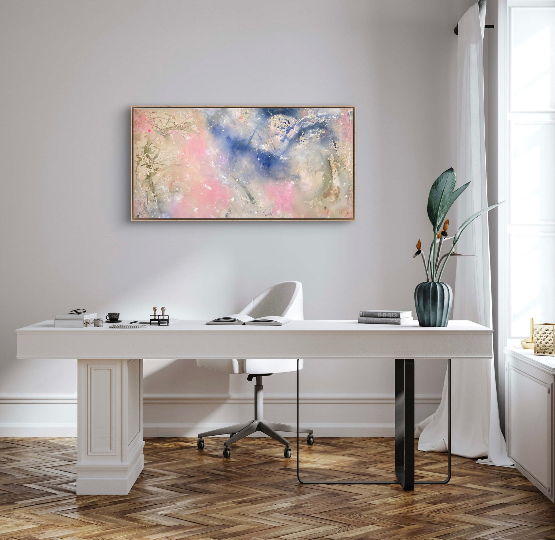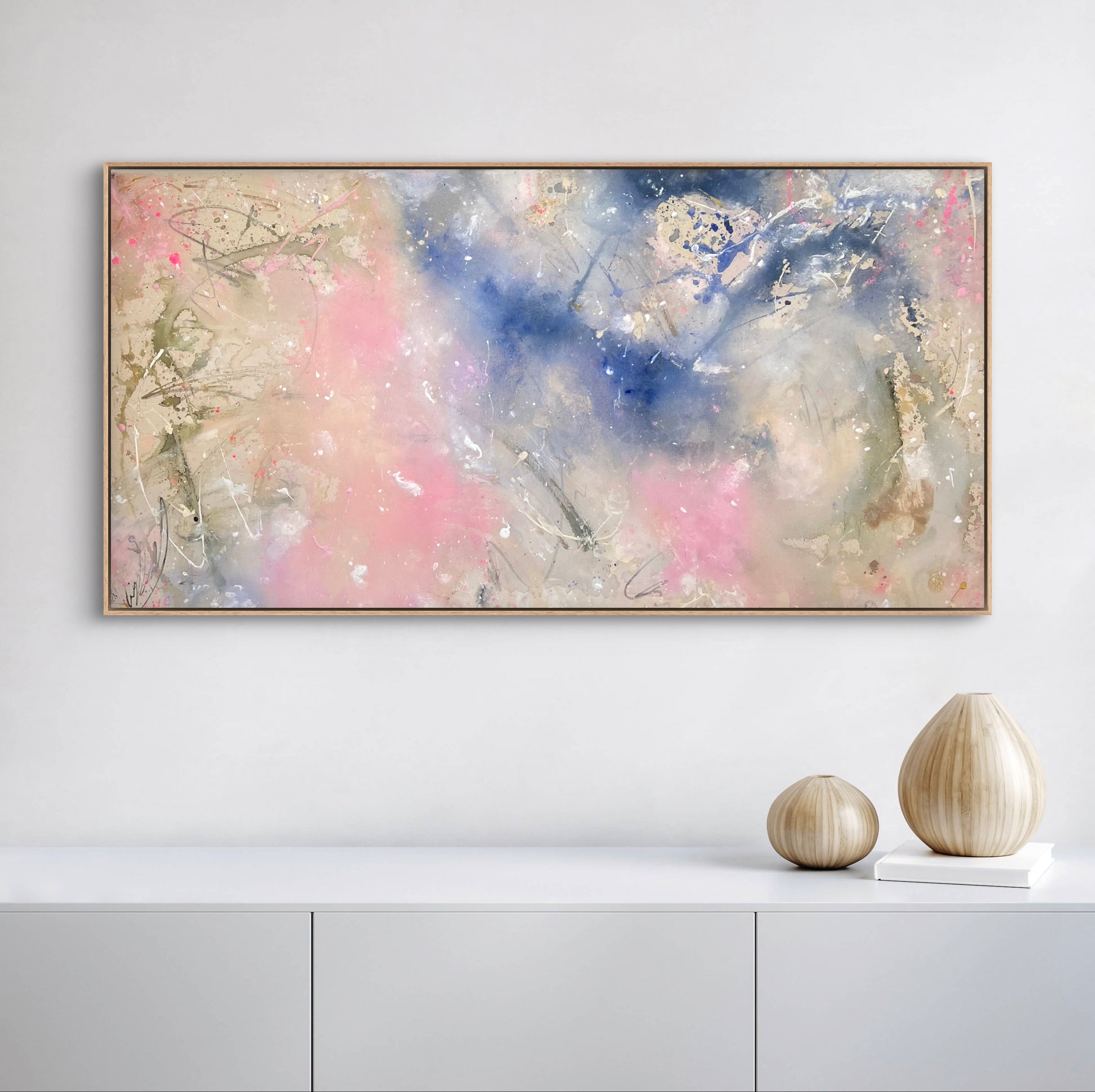 Hand-painted acrylic painting on canvas including shadow gap frame in oak wood