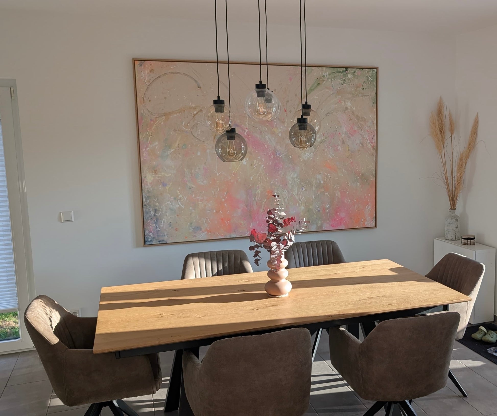 Jetzt gibt es nur noch zu sagen "WIR SIND BEGEISTERT"!!!! Das Werk wirkt im Original noch viel schöner und wir freuen uns jeden Tag aufs Neue darüber. Es hat unser Wohnzimmer richtig aufgewertet. Somit sind wir sehr sehr happy!!!
